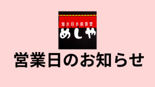 NEWS ・4/1 GW中の営業について 海の目の前食堂めしやは、2026年4月28日から5月10日までは休まず営業予定です。皆様のお越しをお待ちしております! 2026.03.24 NEWS営業日のお知らせ